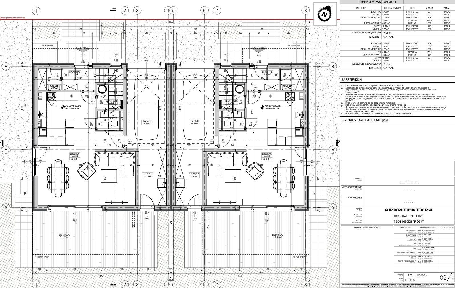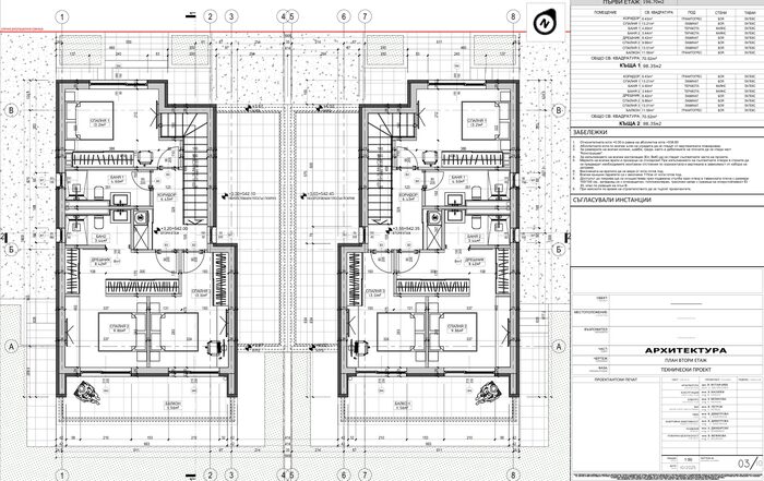 Проекта предвижда изграждането на Осем еднофамилни къщи на два етажа с общо РЗП 205 кв.м. всяка, двор от 200 кв.м. гараж и две парко места.